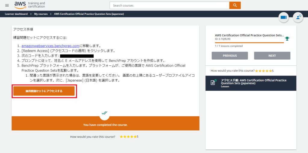 表示されているコードをコピーして「練習問題セットにアクセスする」をクリックします。