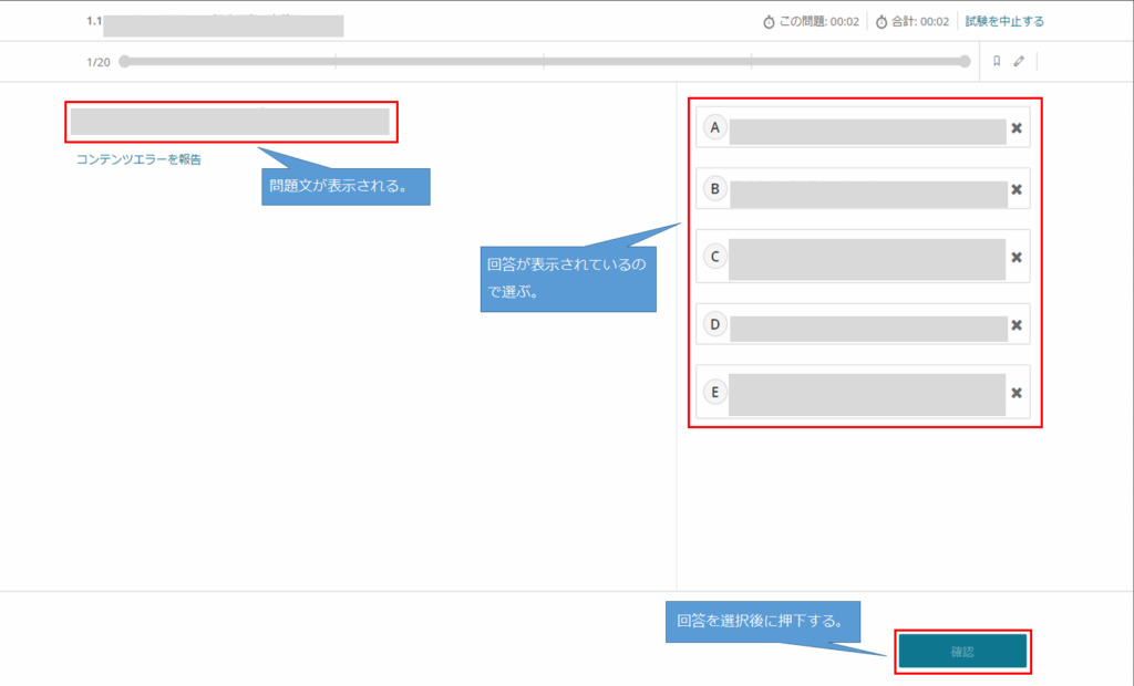 まず左側に問題文が表示され、右側に回答が複数表示されます。その中から正しいと思うものを選び「確認」ボタンをクリックします。