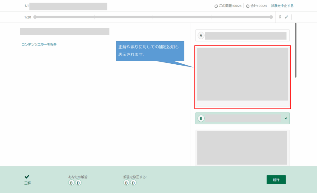 「確認」ボタンクリック後に正誤が一問ずつ表示されます。