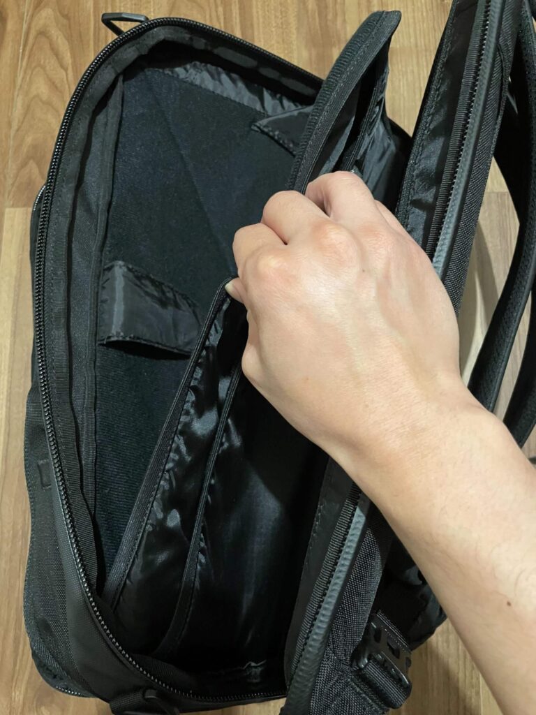 もちろん背面メイン収納部のラップトップ用フリーススリーブへ。